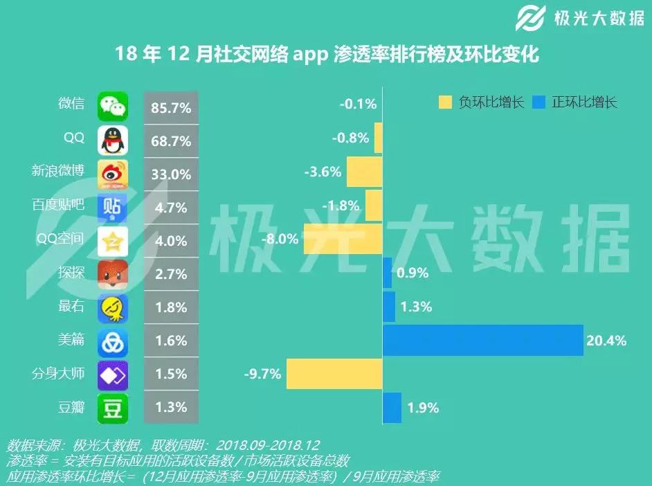 极光大数据的统计结果显示,截至18年12月,社交网络app中排名前三位的是微信、QQ和新浪微博,渗透率分别为85.7%、68.7%和33%。随后是百度贴吧和QQ空间,渗透率分别为4.7%和4%。