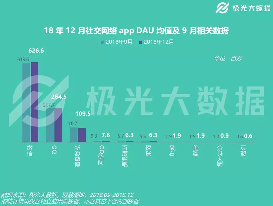 在18年12月,微信的月均DAU接近6.3亿,较同年9月份有所提升。另外两款月均DAU过亿的社交网络app是QQ和新浪微博,前者的月均DAU为2.6亿,后者为1.1亿。