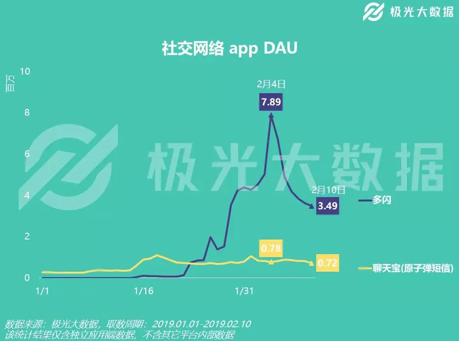 应用上线后,多闪的DAU井喷效应同样显著,但其上升趋势在19年1月底有所放缓。或许是得益于春节红包活动的推动,多闪在除夕当天的DAU数值触及上线后最高点,达到789万。截至19年2月10日,多闪的DAU数值为349万,聊天宝则为72万。