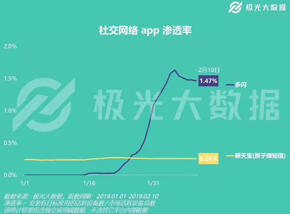 根据极光大数据的统计结果,多闪的渗透率在上线后即迎来井喷,涨势一直延续到春节期间,聊天宝的渗透率则相对较为稳定。截至19年2月10日,多闪的渗透率为1.47%,聊天宝为0.26%。