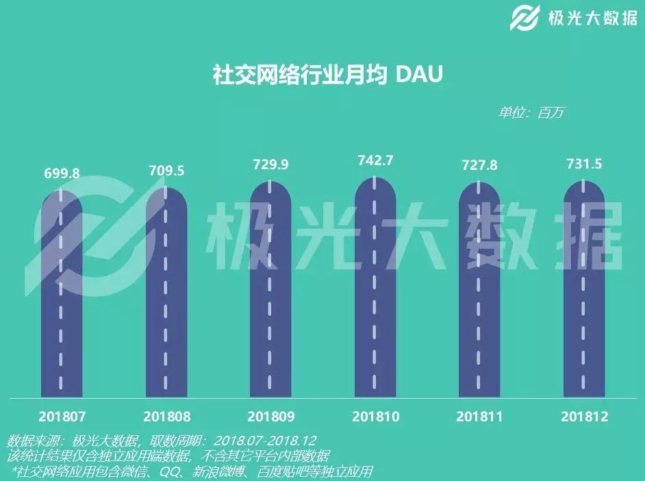社交网络app的行业月均DAU数量也处于一个较高的水平。截至18年12月,社交网络app的行业月均DAU高达7.3亿。在18年下半年,社交网络app的行业月均DAU始终维持在7亿左右。