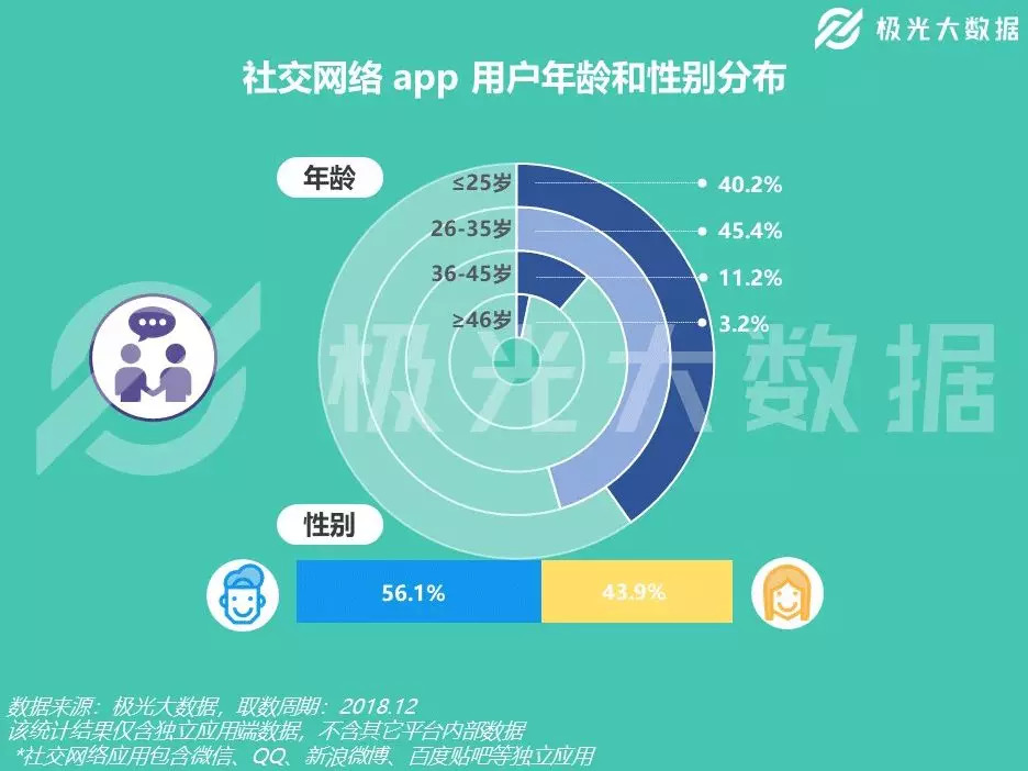 根据极光大数据的统计结果,截至18年12月,社交网络app用户中男性的占比为56.1%,高于女性。与此同时,有40.2%的社交网络app用户年龄在25岁及以下,26-35岁的用户占比达到45.4%,也有14.4%的用户年龄在36岁及以上。