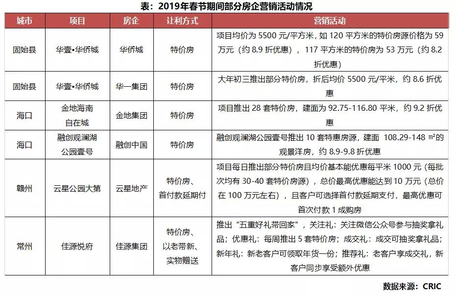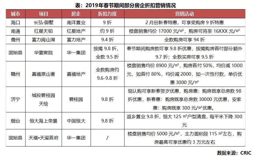 春节期间房企营销表现较为平淡。2019年春节期间,房企表现较为冷淡,“春节返乡置业”并没有改变楼市低迷的情况。从供给方面看,春节期间新推楼盘较少,新推案力度明显下降,市场仍然以去库存、去存量为主要目标,春节两周(1月28日至2月10日)主要40多个重点监测数据显示供应量同比下降29%,供应量不足。从营销角度看,今年春节期间,折扣力度和营销推案力度相比去年都有所下降,开发商自身销售预期也有所下调,并没有寄希望与像往年一样由“返乡潮”带动“购房潮”,没有过多的特别针对春节市场的营销方案推出,部分房企楼盘的“春节不打烊”也只是维持基本运营,并没有推出具体的让利活动。