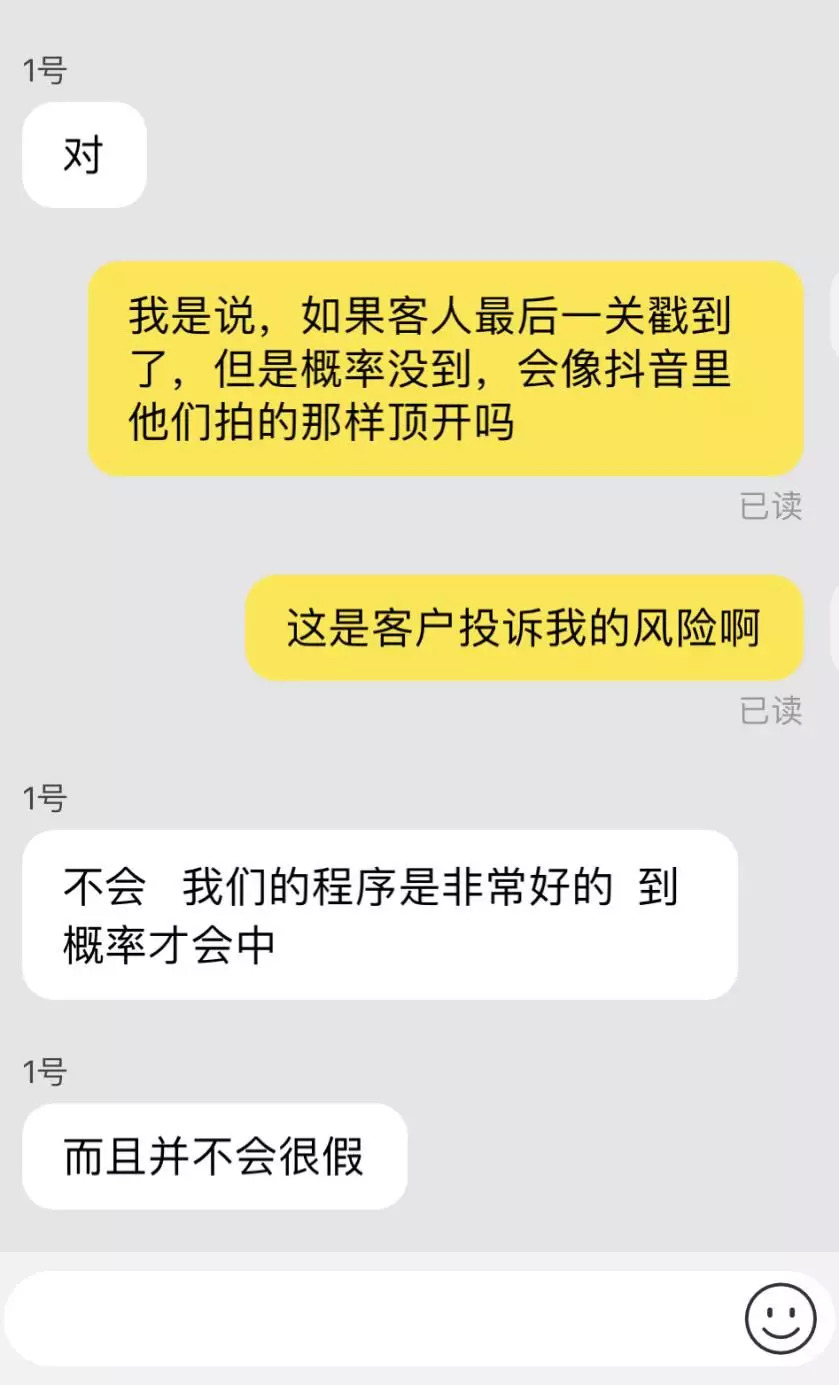 同样是后台控制概率,口红机更加精准,如果说娃娃机还有利用机械原理走走技术流的可能,那么口红机的几率为零。之前有视频流出顾客在最后一关戳到转盘空隙处,却被系统弹开显示闯关失败,就是因为还没到后台设置的中奖概率。