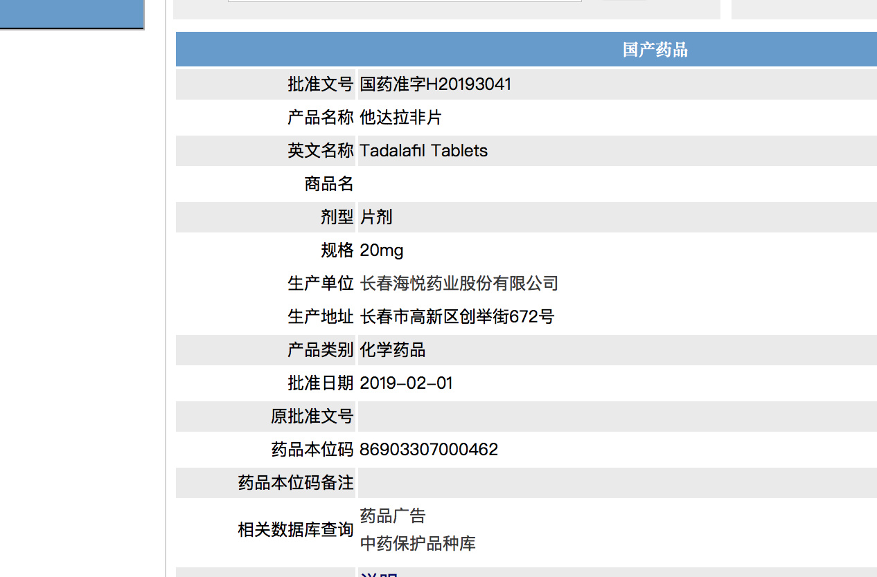 根据国家食药监局公开信息,长春海悦他达拉非片2月1日已经首仿获批上市。他达拉非片原研药为礼来公司的希爱力(Cialis)。