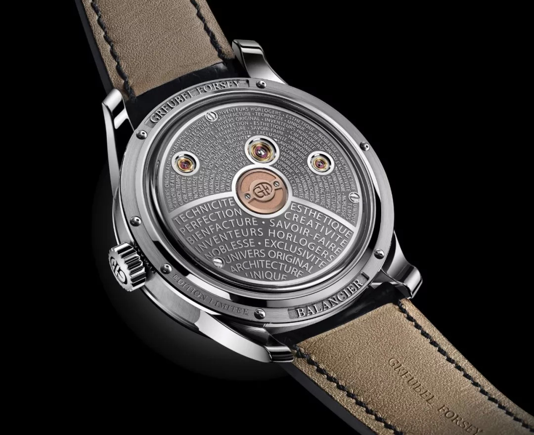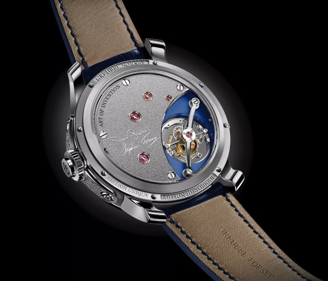 表盘正面,机芯夹板侧面,同样以清晰文字镌刻品牌理念;而背面金质底板以喷砂饰面衬托两位创始人的浮雕签名。