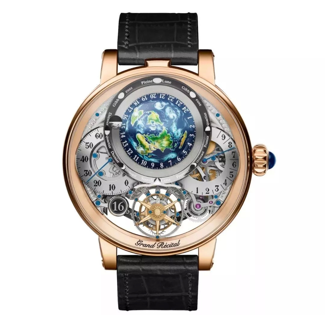 GPHG获奖表款Grand Récital,是播威2018年推出的一款超级复杂功能表:双面表盘,具万年历、飞行陀飞轮、大日历、半球形24小时世界时等功能。