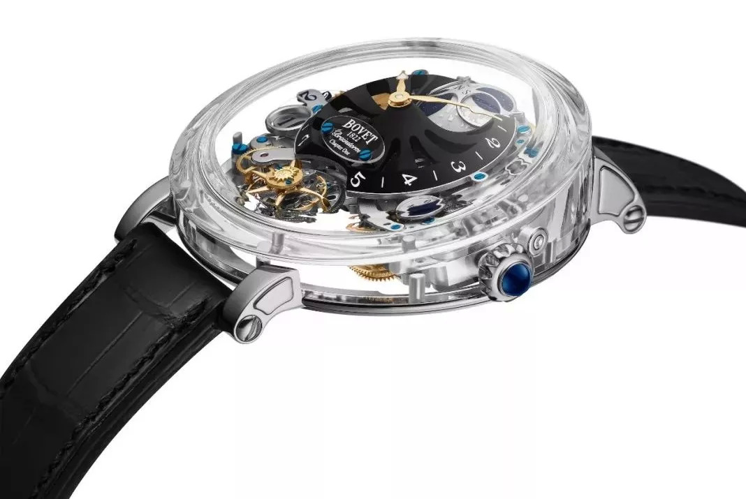 飞行陀飞轮、立体月相、大日期、10天动力储备,是这枚Récital 26的复杂功能;制作难点,还是在于如何以蓝宝石材料呈现“写字斜面形”表壳。