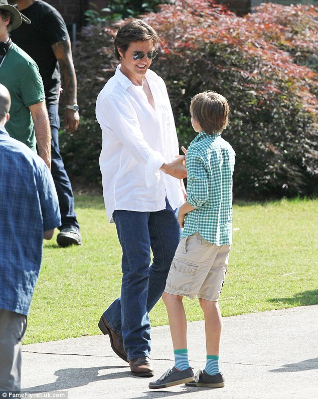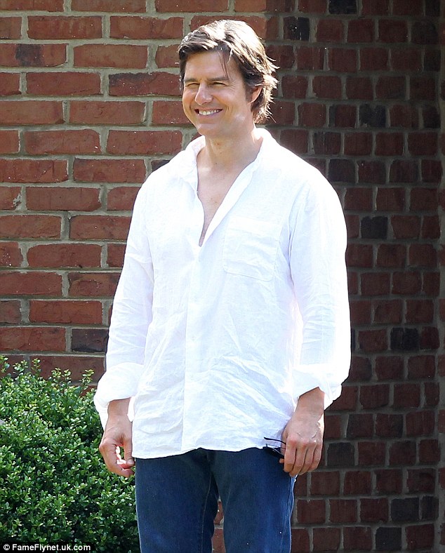 阿汤哥在拍摄现场中穿着紧身的短袖白衬衣,身后跟着一位制片人助手。他穿一条黑色裤子搭配白色衬衣,留着一头标志性的略显凌乱的头发。早前,他被拍到穿着一件宽松的皱T恤和蓝色牛仔裤与一些小孩握手,这些孩子们参与了电影中一场简短场面的拍摄。