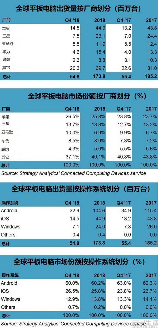 然而,仔细研读报告中的表格,大家都会发现这种“复苏”只不过是“看起来像”而已,具体到数据上,全球平板电脑市场在2018年出货量大降6%,只不过是在2018年第四季度下跌幅度略有放缓,显然不能算真正的复苏。