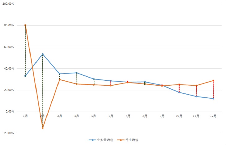 而正是在第四季度,顺丰控股各月份的业务量增速均显著落后于行业,其市场份额流失较重。