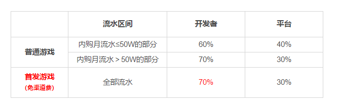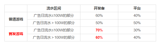 除了渠道费外,首发游戏在广告和内购两项收入上也享有一定的分成优惠。据介绍,普通游戏广告日流水收入不高于100万的部分,开发者的分成比例是60%;超过100万的部分,开发者和平台对半分。首发游戏则享有10%的分成优惠。