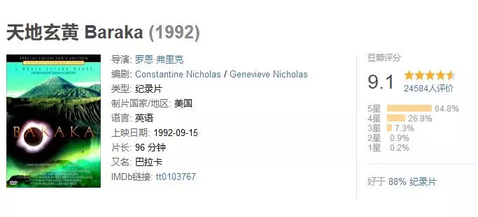 1992年,美国导演 Ron Fricke 带来一部史诗级别的纪录片《Baraka》,Baraka 在阿拉伯语系里是祈福祷告之意,中译名为“天地玄黄”,译者应该是位高人,有种“一语破天机”的磅礴和诗意。