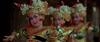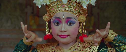 三位印尼少女瞪大眼睛,手足抖动,表演巴厘岛传统舞蹈黎弓舞(Legong Dance)。