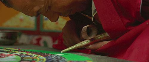 影片尾声,镜头又回到了华美庄严的坛城沙画,这积年累月呕心沥血的创作,可谓拥有无上艺术价值,喇嘛们却在完成之后被毫不吝惜地全盘抹去,顷刻之间,一切归零。