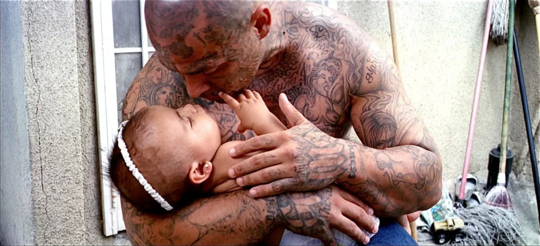 纹身壮汉把女儿抱在怀里,颇有猛虎嗅蔷薇之感。