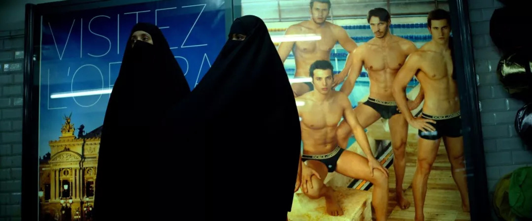 全身裹黑纱的阿拉伯妇女,站在只着内裤的男模海报前面。