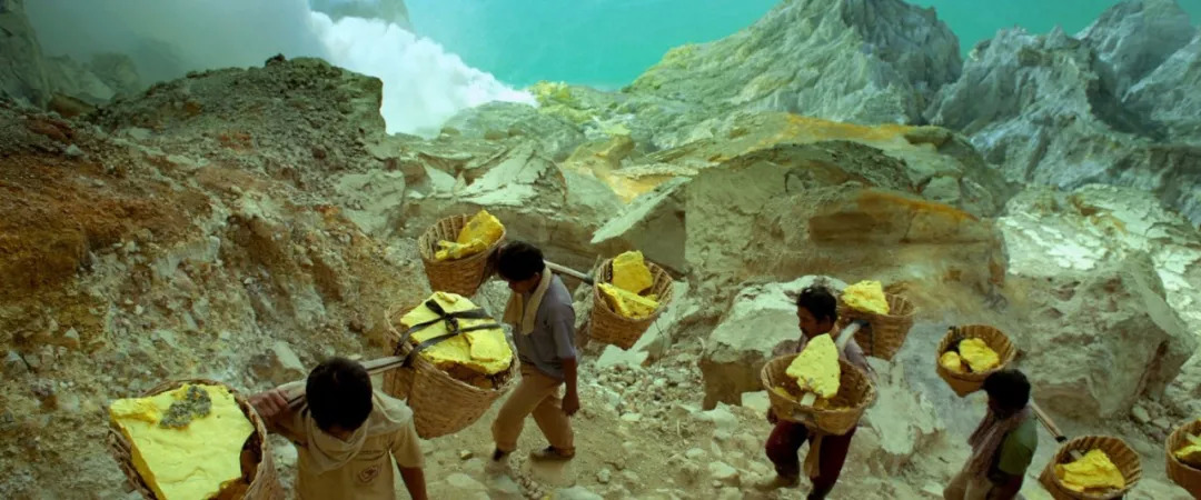 印尼卡瓦伊真火山(Kawah Ijen),赤膊的工人们在极具腐蚀性的硫酸雾气中,把成筐的硫磺挑下山。据说这里的矿工都活不过30岁。