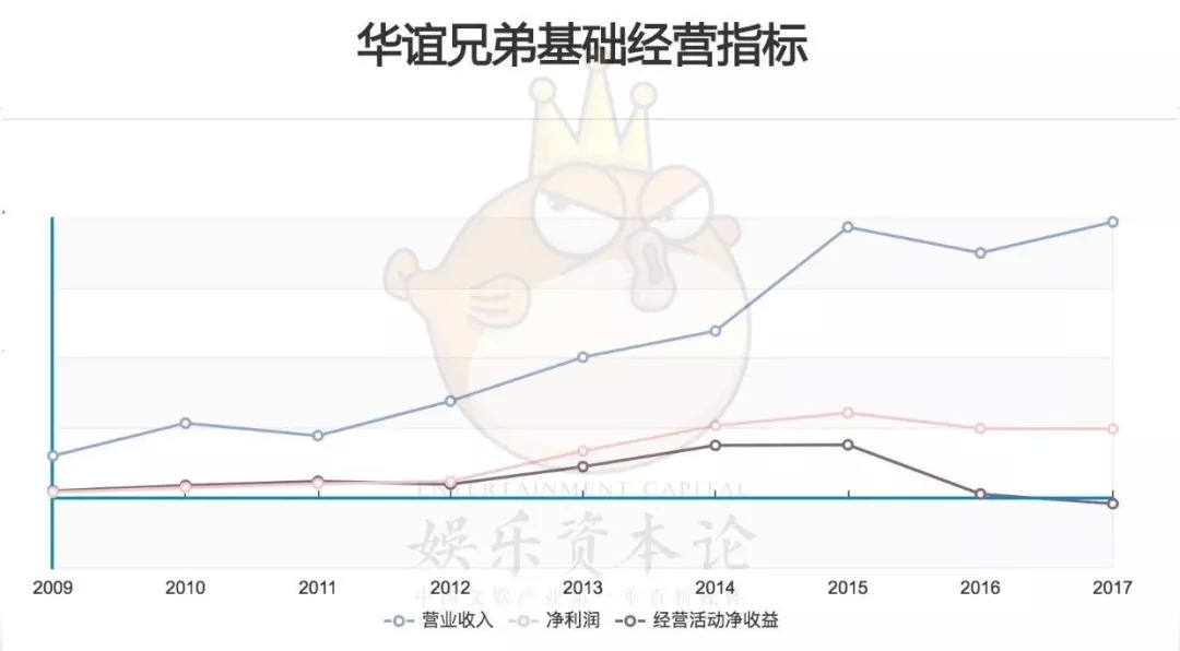 业务重心的调整直接反映在了营收上,华谊兄弟没能跟上整个影视行业那几年的高速发展。在此后几年间,不断抛售游戏公司股票获得的投资收益甚至还承担了“遮羞布”的作用——核心利润增幅持续下滑,主营业务营收两次下滑、2016年一度出现亏损,盈利靠投资。