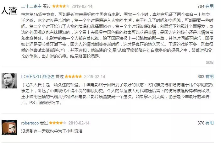 在《地久天长》之前,中国电影已经有长达五年,没有在柏林获得大奖。自2014年到2019年,中国电影票房从296亿上涨到了607亿,来自艺术上的褒奖却屈指可数:《大象席地而坐》只是被柏林评委会特别提及,动画《好极了》成首度入围三大电影节的动画片,《长江图》摘得第66届柏林国际电影节的最佳艺术贡献奖。