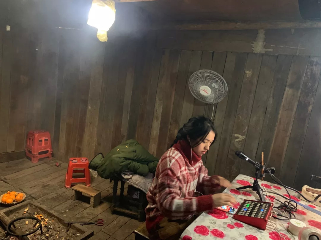 最开始,“七仙女”在洋卫寨拍摄,杨妮丹、吴梦霞、吴兰欣住在寨子里的小学楼里,“晚上有些害怕,后来就好了。”吴亮是团队助理,他家就在学校旁边,每天早上会去叫姑娘们起床拍视频、做直播。