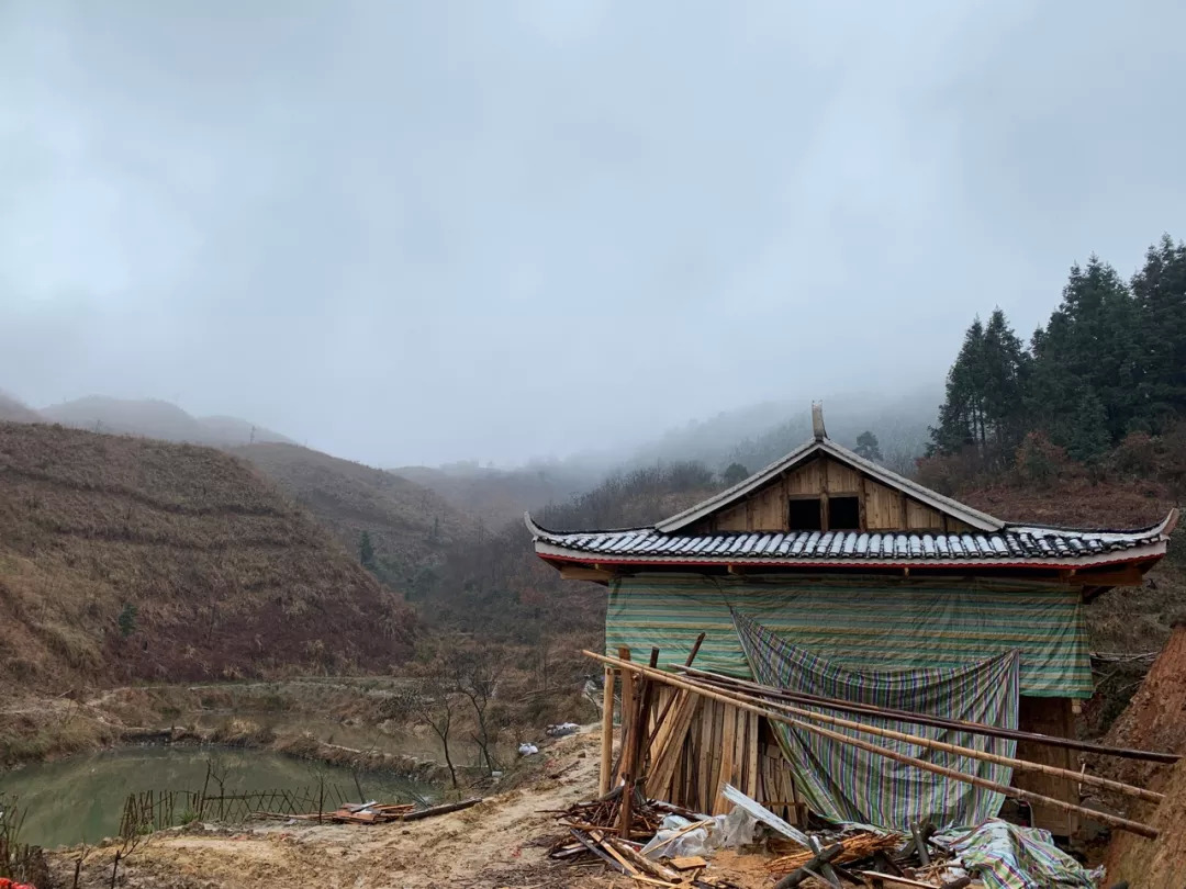 这栋房子是他们桃源计划中的一部分。2018年初,他们在袁桂花家的鱼塘旁边建了一个茅草屋,一开门,就能看到菜地、鱼塘、竹林和大山,与东晋文学家陶渊明《桃花源记》中描述的“土地平旷,屋舍俨然,有良田美池桑竹之属。阡陌交通,鸡犬相闻”场景大致相同,颇有意境。