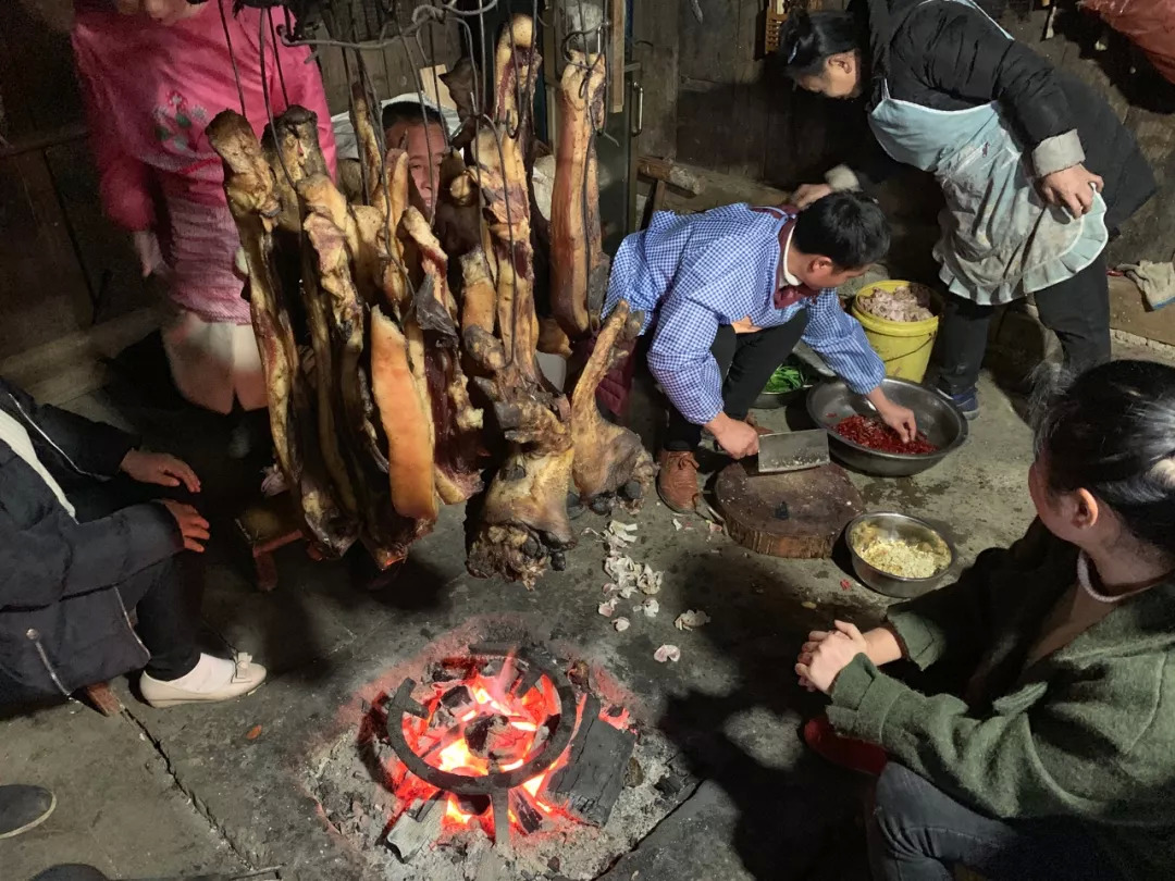 王启红的家人、火塘和腊肉,当时他们正在做焖羊肉