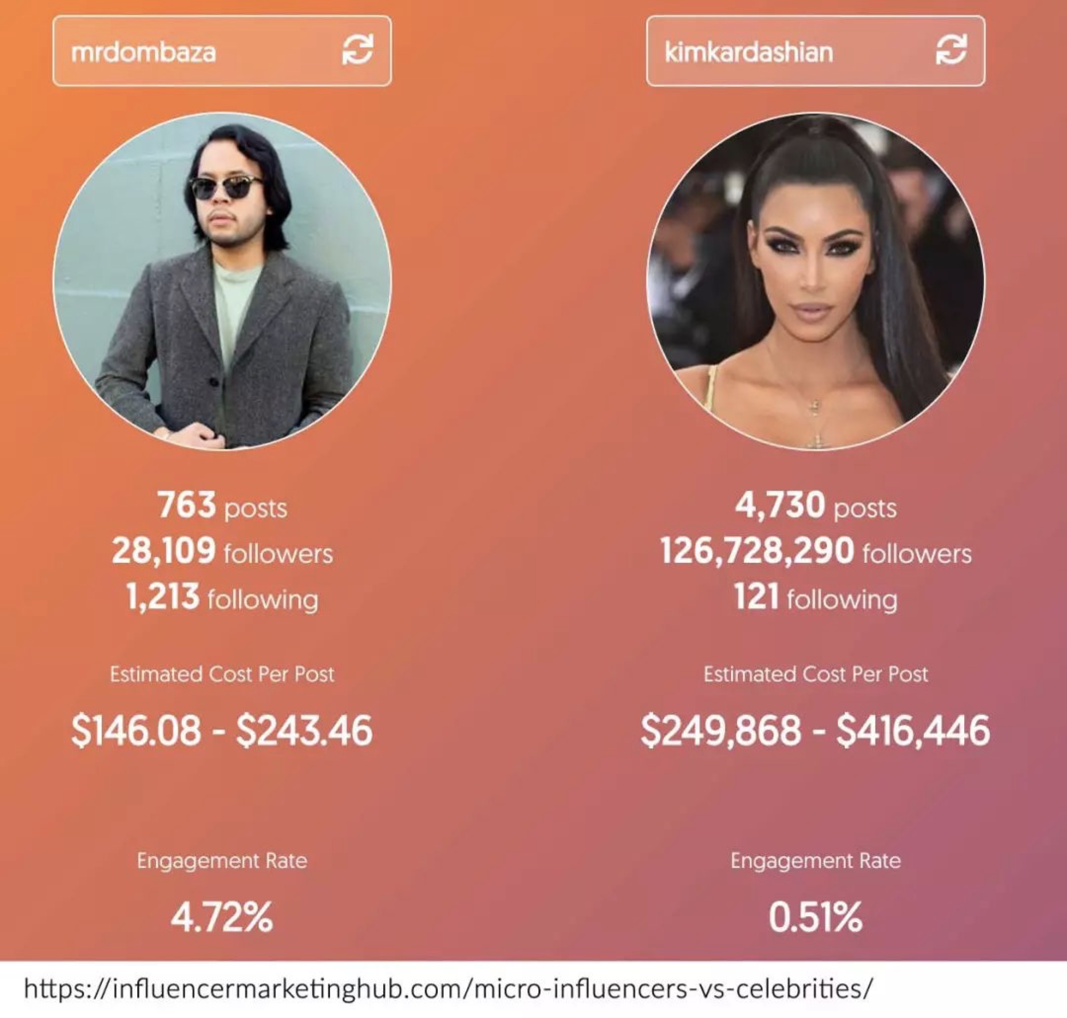 不管是中国还是海外,品牌都遇到过KOL影响力虽然大但无法带来实际回报的情况。想在西方推广自己的品牌?你可能会认为金·卡戴珊是最佳选择。但是实际情况更加微妙:比如Mr. Dombaza是旧金山音乐家,虽然只有28,000名粉丝,但Instagram的参与度比Kim Kardashian高10倍。
