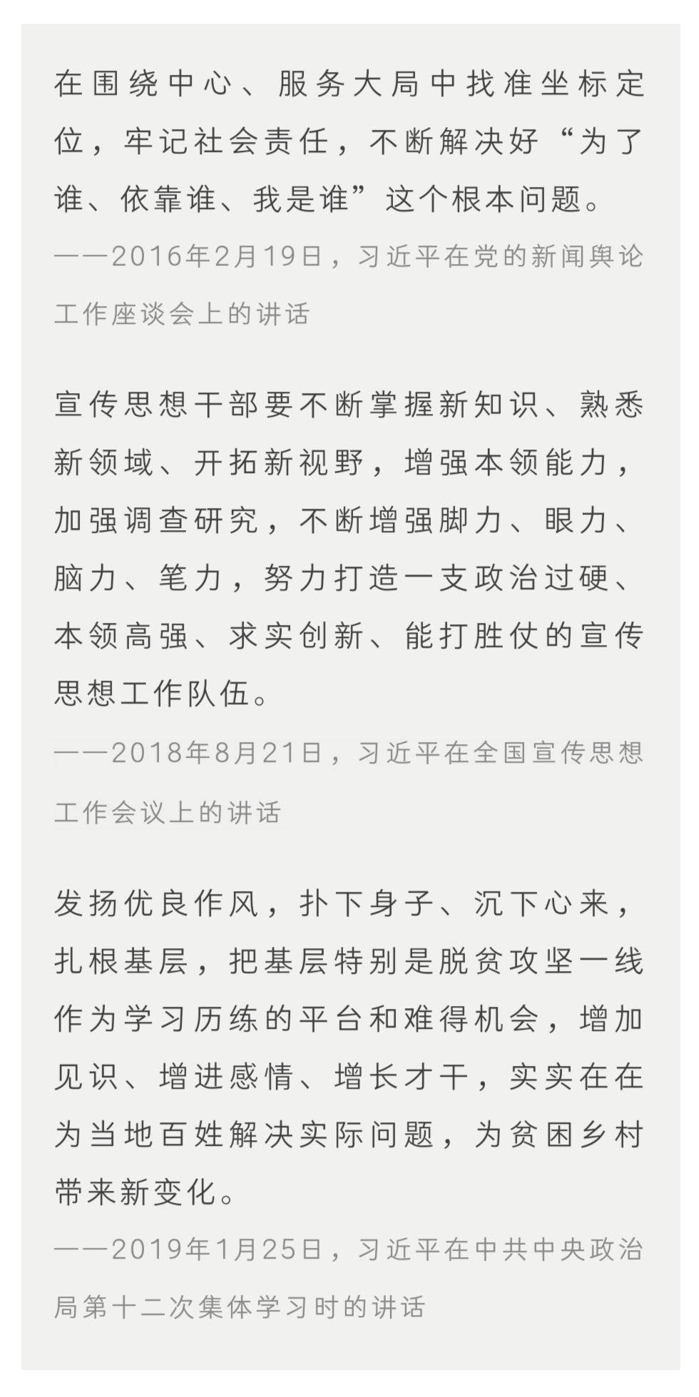 2016年2月19日,习近平总书记到人民日报社、新华社、中央电视台等3家中央新闻单位进行实地调研,随后主持召开党的新闻舆论工作座谈会。在座谈会上,习近平用48字概括了党的新闻舆论工作的职责和使命:高举旗帜、引领导向,围绕中心、服务大局,团结人民、鼓舞士气,成风化人、凝心聚力,澄清谬误、明辨是非,联接中外、沟通世界。