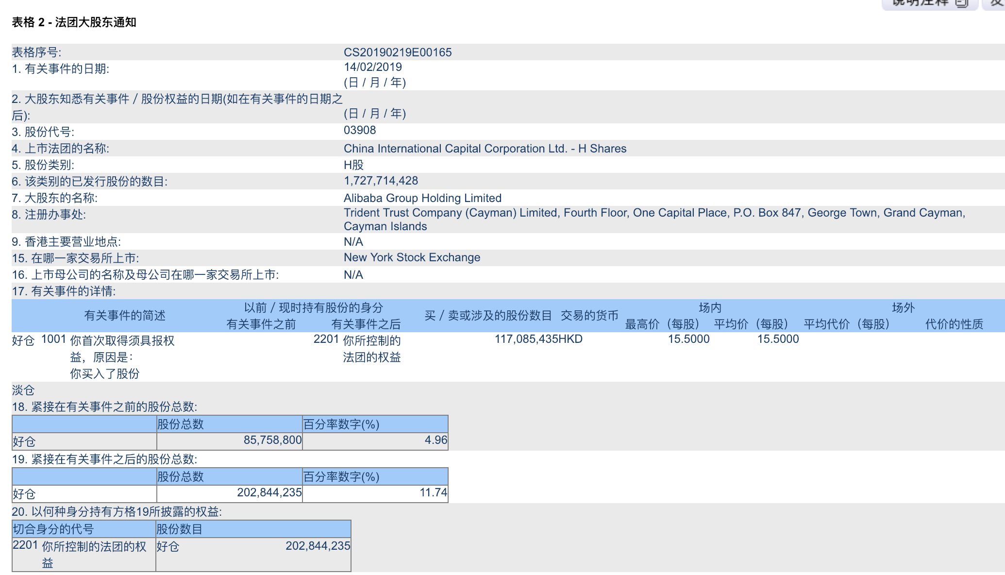 2019年2月19日,阿里巴巴集团透露,已于近日完成对中国国际金融股份有限公司(3908.HK,“中金公司”)的入股,持有中金公司港股约2.03亿股,占其港股的11.74%和总已发行股份的4.84%。