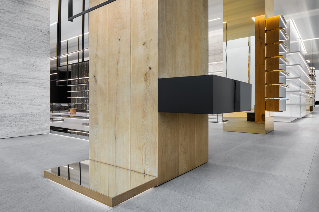 麦迪逊大道650号的Celine旗舰店代替了之前位于870号的旧旗舰店。不同于Slimane在Saint Laurent期间典型的黑白大理石风格,Slimane这次将更加温暖的元素带到了Celine新概念店,例如木质家具。不过总体来说,Celine新门店的风格依旧很有Slimane的风格,无论是玄武岩的地板,还是黑白融合、配上一点点姜黄色的花岗岩墙壁和架子,都显得有些冷峻。