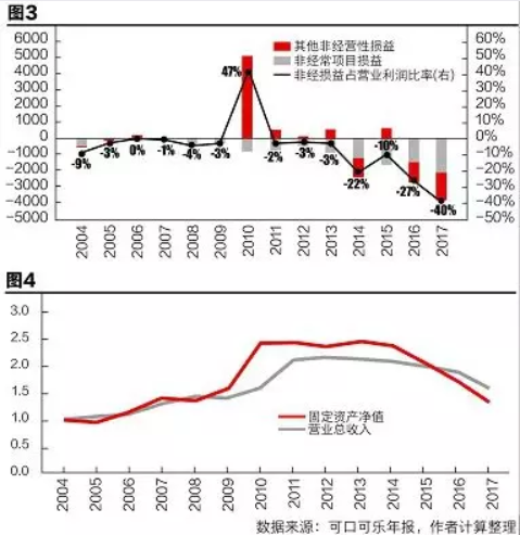 研究可口可乐并购分拆史可以看到,2010年前,非经常性项目对利润表的影响很小,2010年出现一个巨大的正贡献,然后从2013年开始对利润的侵蚀越来越大。(参见图3)