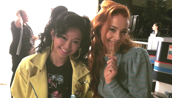 见到新面孔!《权利的游戏》的苏菲·特纳(图右)穿上了她的灰色琴·葛蕾戏服,拉娜·康多(图左)在另一幕中出演朱比莉。导演布莱恩将这张照片分享至网络。