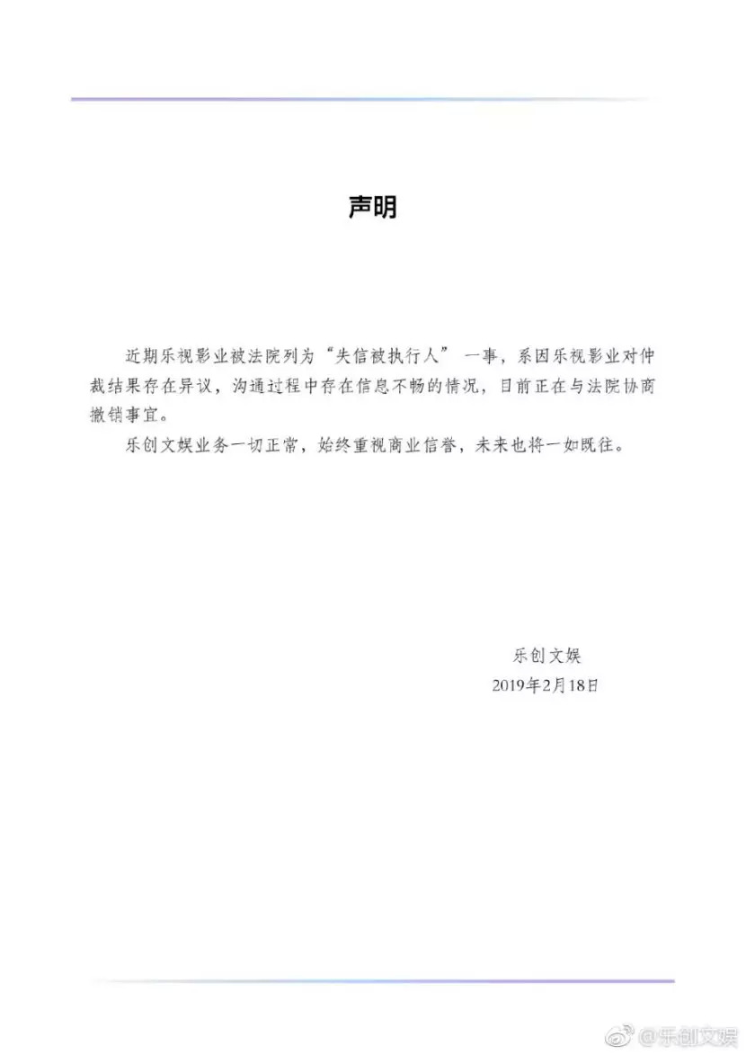 昨日,一篇源自《证券日报》的文章《乐视影业首次被列入失信名单,一众明星被套牢》被各大媒体争相转发。稍后,乐创文娱官方微博发表声明给予解释,并表示正在与法院协商撤销“失信被执行人”事宜。