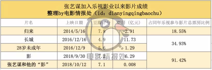纵观张艺谋加入乐视影业后的成绩表单,他参与的影片票房占乐视影业同年参与的影片总票房的比例一路飞升,从2014年的18.55%,一直飙升至去年的91.42%。张艺谋之于当时的乐视影业,无疑是金字招牌,也是救命稻草。