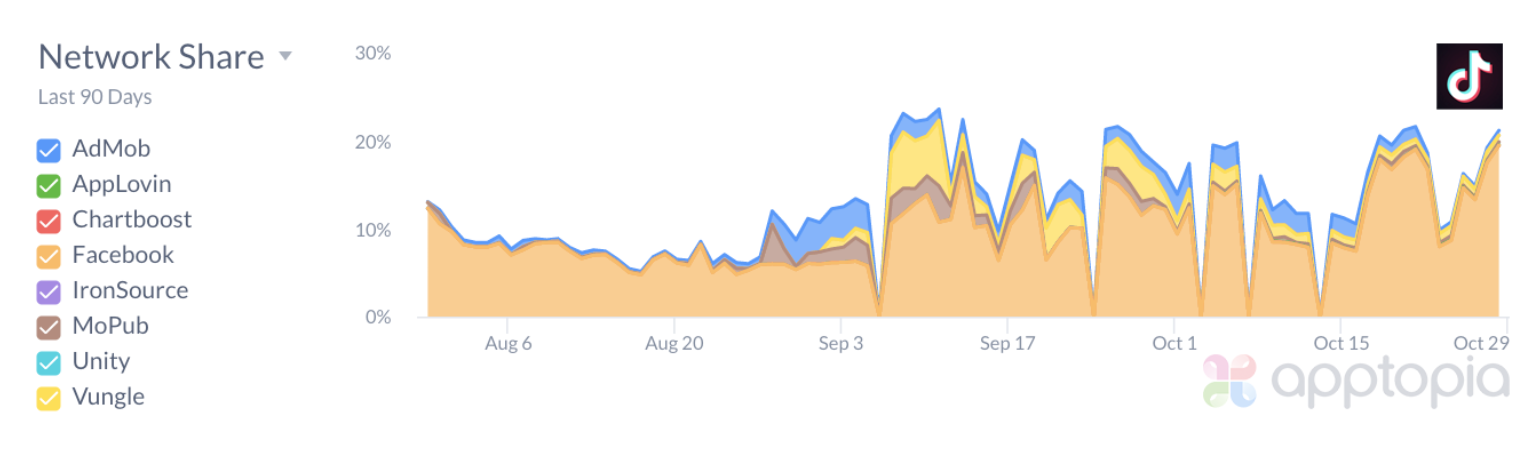 下图是Apptopia检测到的广告数据,可以看到,自去年8月以来,TikTok一直在逐步扩大其广告支出,且在不断尝试新的投放渠道。10月,TikTok在北美的下载量排名甚至一度超过了Facebook和Instagram。