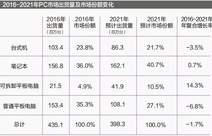 根据IDC的统计和预测,2016年全球市场台式机出货量为1.03亿台,仅占PC总出货量的23.8%;到2021年,台式机出货量将下降到8 630万台,在整个PC领域占比也将下降至21.7%。