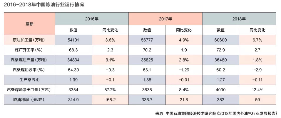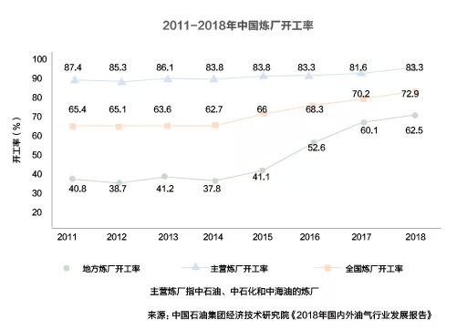 炼油产能过剩的形势已经非常严峻。据中国石油集团经济技术研究院发布《2018年国内外油气行业发展报告》称,2018年中国石油表观消费为6.25亿吨,同比增加0.41亿吨,增速为7%。2018年国内炼油能力过剩0.9亿吨/年左右,而2019年的过剩产能则将升至约1.2亿吨/年,同比增长三分之一。