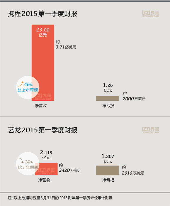艺龙第一季度总营收为人民币2.258亿元,比去年同期的人民币2.627亿元下滑14%;第一季度净亏损为人民币1.807亿元,与去年同期的净亏损人民币3540万元相比扩大逾5倍。