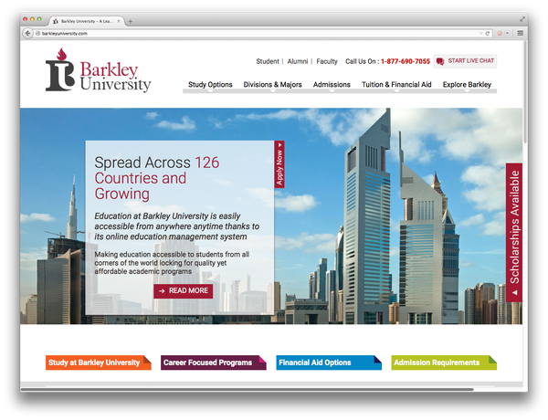 Axact旗下的大学和高中看起来只在表面有一些相似之处:华丽的网站、免费的美国热线电话、有意挑选的一些看着眼熟的名字,比如巴克利(Barkley),哥伦比亚纳(Columbiana)和林肯山(Mount Lincoln)。但还有一些蛛丝马迹能表明它们同属一家公司,很多网站都和一些虚假的认证机构有关联,并且有相同的图形,比如绿色的浮动窗口,上面有一个头戴耳机的女性在邀请顾客进行对话。技术方面也有着共同之处:一片片完全相同的定制代码,并且大部分网站的流量都转向两台服务器,它们由注册地在塞浦路斯和拉脱维亚的公司掌管着。