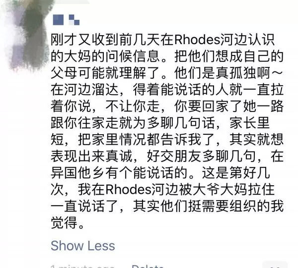 发朋友圈的小伙伴家住悉尼Rhodes,某天下楼闲逛时被一位大妈拉住谈心,聊了一路,还不让走。她在朋友圈里写道:“这是第好几次,我在Rhodes河边被大爷大妈拉住一直说话。”