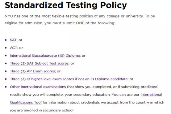 哥伦比亚大学巴纳德学院也宣布,新入学的申请者不再需提交SAT写作成绩及SAT 科目考试(subject test)成绩。纽约大学号称自己拥有最有弹性的考试政策,除了SAT、ACT成绩之外,也可以接受IB、AP成绩以及其他材料。