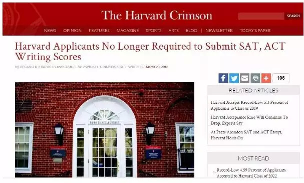 取消应试成绩,芝加哥大学此举立刻引发了连锁反应。哈佛大学很快也跟着宣布,2019年秋季开始,申请者不再需要提交SAT、ACT写作部分的成绩。