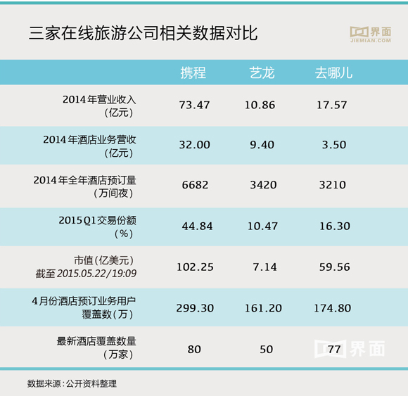 竞争对手在不断进攻。与2013年相比,去哪儿和途牛营收增长较为明显,其中以去哪儿增幅最为强劲:2014年全年总营收为17.57亿元人民币,同比增长达到106.5%。