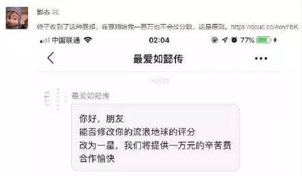 《流浪地球》的豆瓣低分事件中也少不了这些职业黑粉的身影,黑粉们在给电影打出一星的评论中出现了牛头不对马嘴的陈述,明显就是连电影内容都没有看的恶意评分。且有豆瓣瓣友爆料,在他们打出五星好评之后,有专门的账号联系他们有偿修改星级,而据悉这种有偿在两百元到一万元不等,根据账号的影响力来衡定。