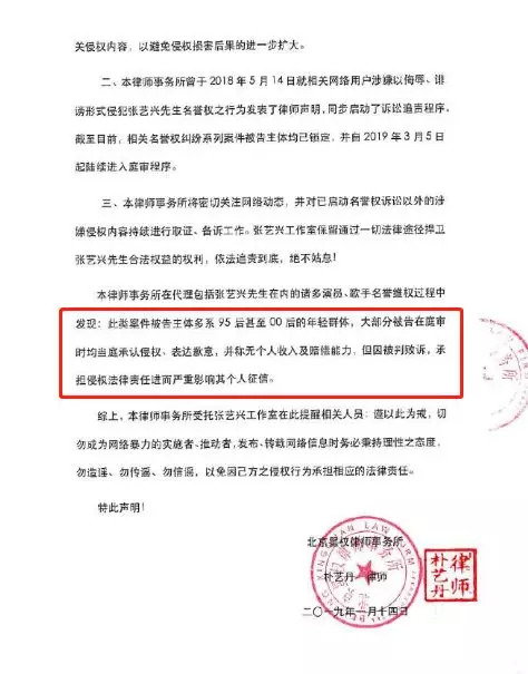 在张艺兴工作室的一纸起诉书上有这样一段话,“此类案件被告主体多为95后甚至00后等年轻群体……并称无个人收入及赔偿能力”,在越发低龄化的网络世界中,若是长期通过营销号来获取信息,缺乏经验的年轻群体很容易随波逐流,被当成枪使,这些充满悔意的年轻人便是摆在眼前的例子。