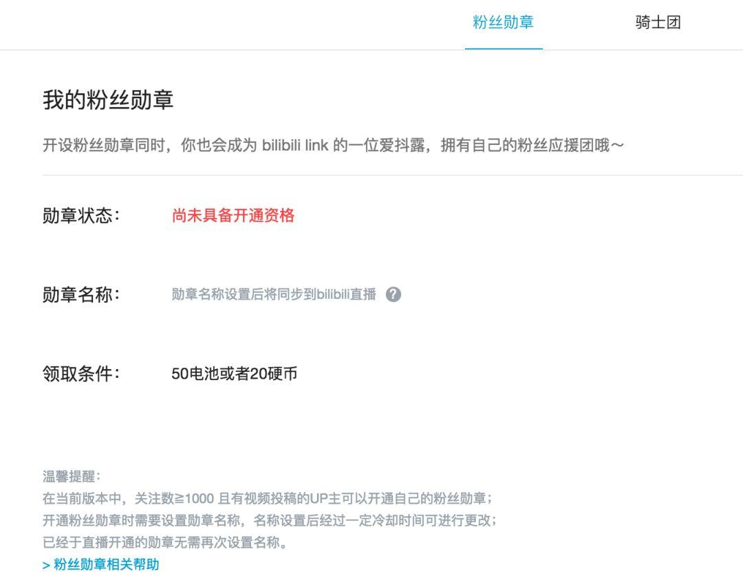 关注数大于1000或者播放数大于10万的up主可开通粉丝勋章,并设置自己的勋章名称;另外还可以指定“骑士”,给予一定权限来维护弹幕、评论、直播间。