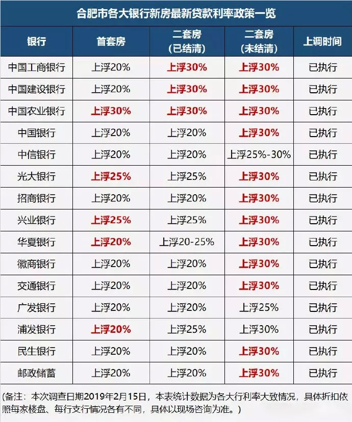 但仍有4家银行表示还未接到通知,目前尚未实施。这四家银行是中国农业银行(庐阳区支行)、邮政银行(四牌楼支行)、兴业银行(长江路支行)、民生银行。其中农业银行庐阳支行的工作人员表示:我们这边目前首套上浮20%,二套不论有没有结清,都按上浮30%来算。