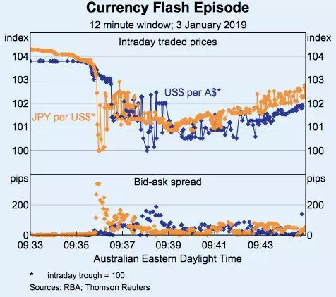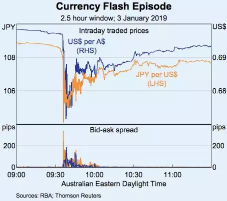 今年初的1月3日,外汇市场发生了一次不寻常的波动。亚洲开市后的几分钟内,美元兑日元突然暴跌,甚至一度超过400点。这场“闪崩”剧情迅速蔓延到其他市场,澳元下跌并被大量抛售。