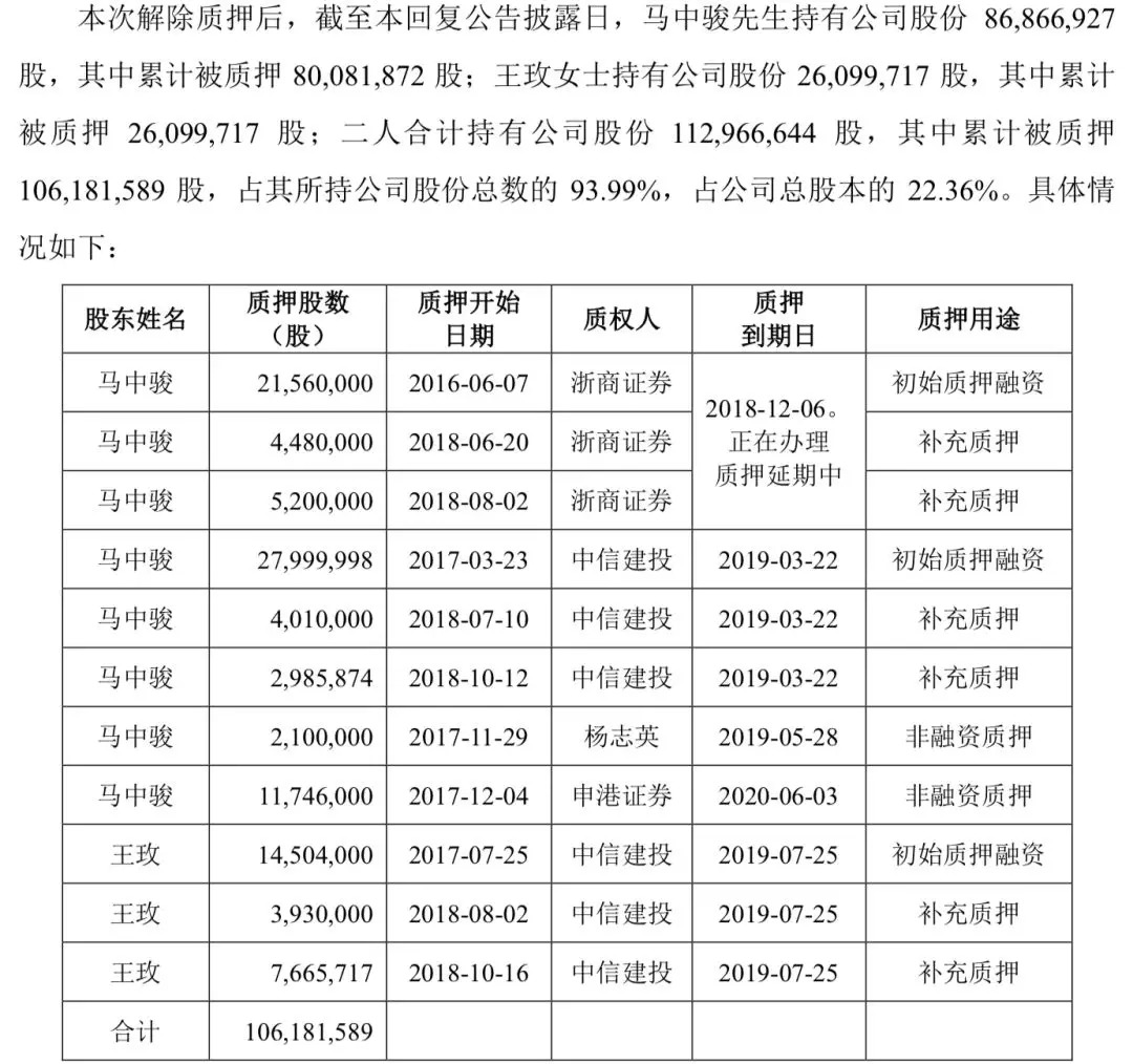 根据1月18日对深交所问询的回复,截至公告当日,马中骏及王玫二人合计持有公司1.13亿股,其中累计被质押1.06亿股,质押股份数量占其持股总数比例高达93.99%,占公司总股本的22.36%。